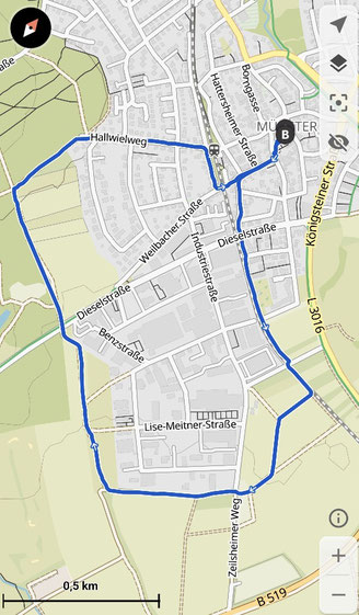 Es ging weiter um das Industriegebiet herum bis zur Dieselstraße und weiter aufwärts zum Wald, den Hallwielweg hinunter, über die Nonnbornstraße, die Bahngleise und die Hofheimer Straße zurück zum Kirchplatz in Kelkheim-Münster.
