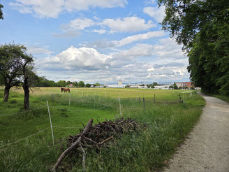 Vom Kirchplatz ging es erstmal die Hofheimer Straße rauf, dann links in die Zeilsheimer Straße, weiter auf dem Zeilsheimer Weg an der Bahnlinie entlang, hinter dem alten Friedhof Kelkheim-Münster vorbei bis zur Paul-Ehrlich-Straße und dann ins Feld in Richtung Liederbach mit Blick auf das Industriegebiet Kelkheim-Münster.