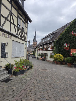 Danach ging es durch die schöne Stadt Hochheim, mit vielen Fachwerkhäusern und engen Gassen. Weiter durch Hochheim, dann durch die Wiesen, den Langgewannweg, den Mühlweg und über die Bahngleise zur Hauptstraße. Dann wieder an den Main zurück und zur Einkehr ins "Restaurant zum Engel".