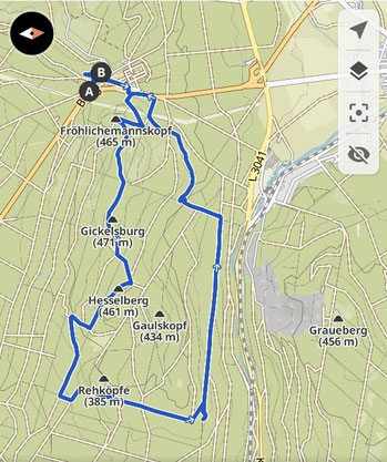 Von der Saalburg ging es zum Fröhlichemannskopf (465 m), zum Gickelsburg (471 m), Hesselberg (461 m), um den Gaulskopf (434 m) zu den Rehköpfe (385 m). Von hier zum Säunickels Kleiderschrank und zurück am Quarzwerk Saalburg vorbei, entlang des Köpperner Tal zurück zur Saalburg. Hier war Einkehr im "Landgasthof Saalburg".